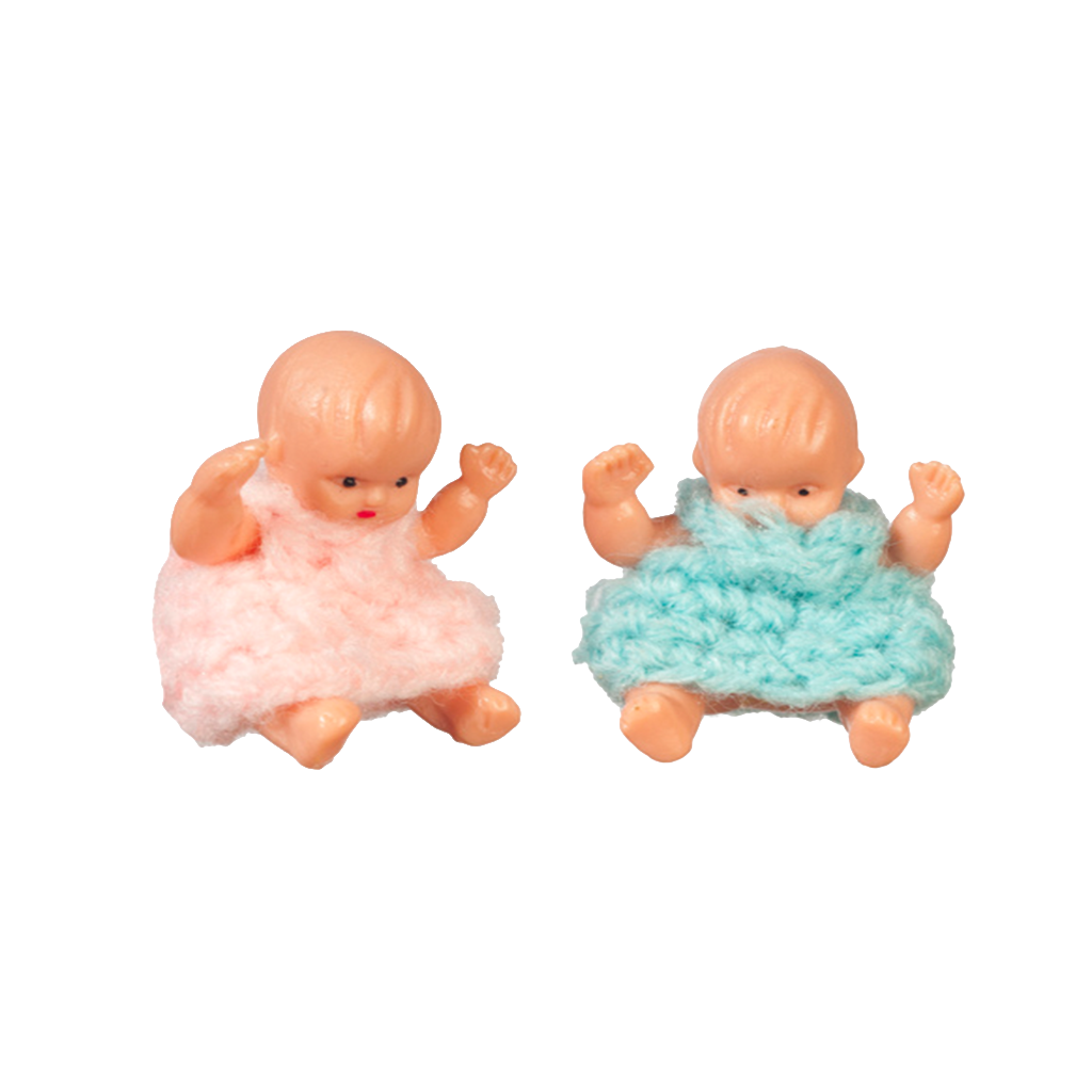 Enjoy this adorable set of baby dolls. I would say these are toys for your boys and girls. Each set includes one Baby Girl and one Baby Boy, dressed as shown in the photo. A perfect way to accessorize your 1 inch scale dollhouse. Each baby doll measures approximately 1"H x 3/4"W. ALL SALES ARE FINAL.