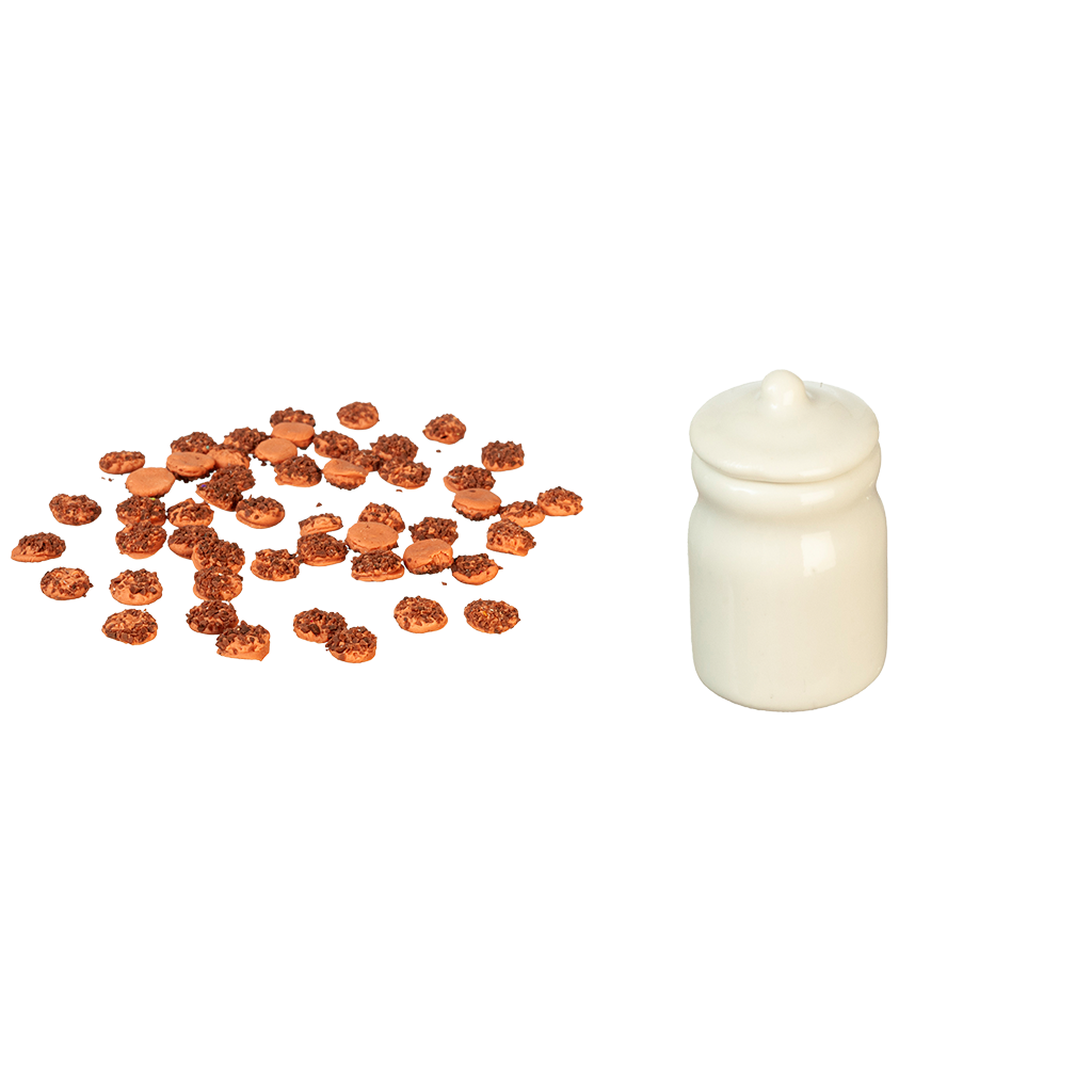 Create your own cookie extravaganza using this cute set of Chocolate Chip Cookies and Cookie Jar. The Cookie Jar features a removable lid so you can fill it up with the miniature Chocolate Chip Cookies. Each set includes the Cookie Jar and approximately 50 Chocolate Chip Cookies. The Cookie Jar measures approximately 3/4"H x 1/2"Diameter. 1 inch scale.
