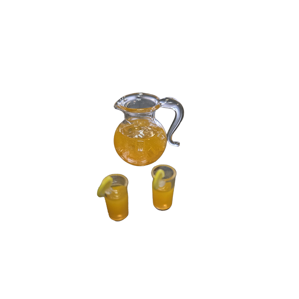 Did someone say refreshing beverage? Enjoy decorating at all levels by adding some of your favorite drinks to your 1 inch scale dollhouse. The Orange Drink Set arrives and looks the same as in the photo. Each set includes the pitcher and two glasses full of this refreshing drink. The Pitcher measures approximately 7/8"Tall x 3/4"Diameter and each full glass is 5/8"Tall (including lemon) x 1/4"Diameter.