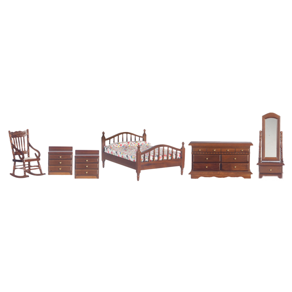Complete your dollhouse using this 1 inch scale or 1/12th scale dollhouse Master Bedroom Set in Walnut. Includes double bed, two night stands, bureau, rocking chair and full length, free standing mirror. 6 pieces.