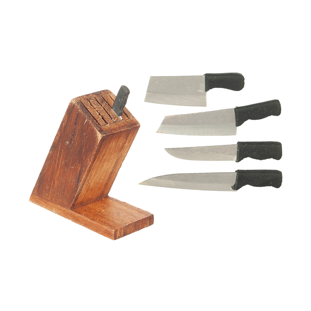 Create kitchen magic using this 1 inch scale Knife Block, aka Knife Holder or Butcher Block, with 5 knives. The knives are removable which makes this so realistic. The sets I received, the wood looks darker than the photo but otherwise it is exactly the same. This is a must have for any mini kitchen. The Knife Block with Knives approximately 1 1/2"H x 5/8"W x 1 3/8"D.