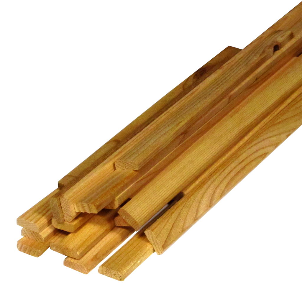 The Red Cedar Logs measure 5/16 inch thick by about 7/8 inch wide, flat on one face and rounded on the other, with variable lengths up to 20 inches. The logs shown in the photo had almost exactly 300 inches of Red Cedar Logs (~25 feet).